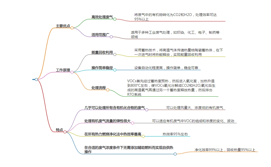 RTO的運行過程可以分為三個階段:預(yù)熱、氧化分解和冷卻。在預(yù)熱階段,有機廢氣被蓄熱體預(yù)熱,然后進入燃燒室進行燃燒。在氧化分解階段,燃燒后的高溫氣體流經(jīng)陶瓷蓄熱體,蓄熱體釋放熱量,預(yù)熱后續(xù)進入的有機廢氣。在冷卻階段,蓄熱體吸熱,高溫氣體被冷卻后排出。這樣,RTO可以實現(xiàn)有機廢氣的高效處理,同時回收分解時所釋放的熱量。
